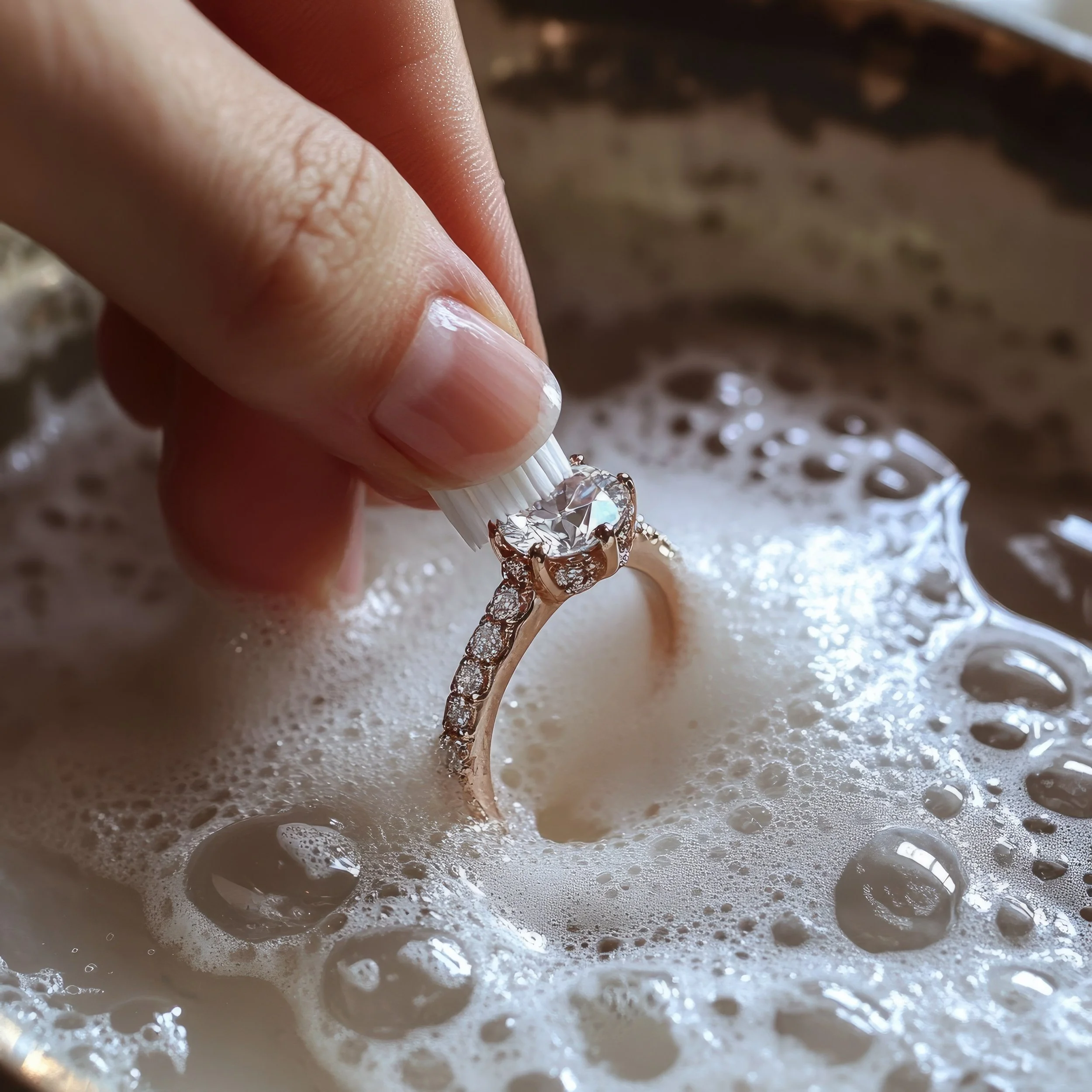 Gently scrub the diamond with a soft toothbrush, focusing on the crevices where dirt may gather.